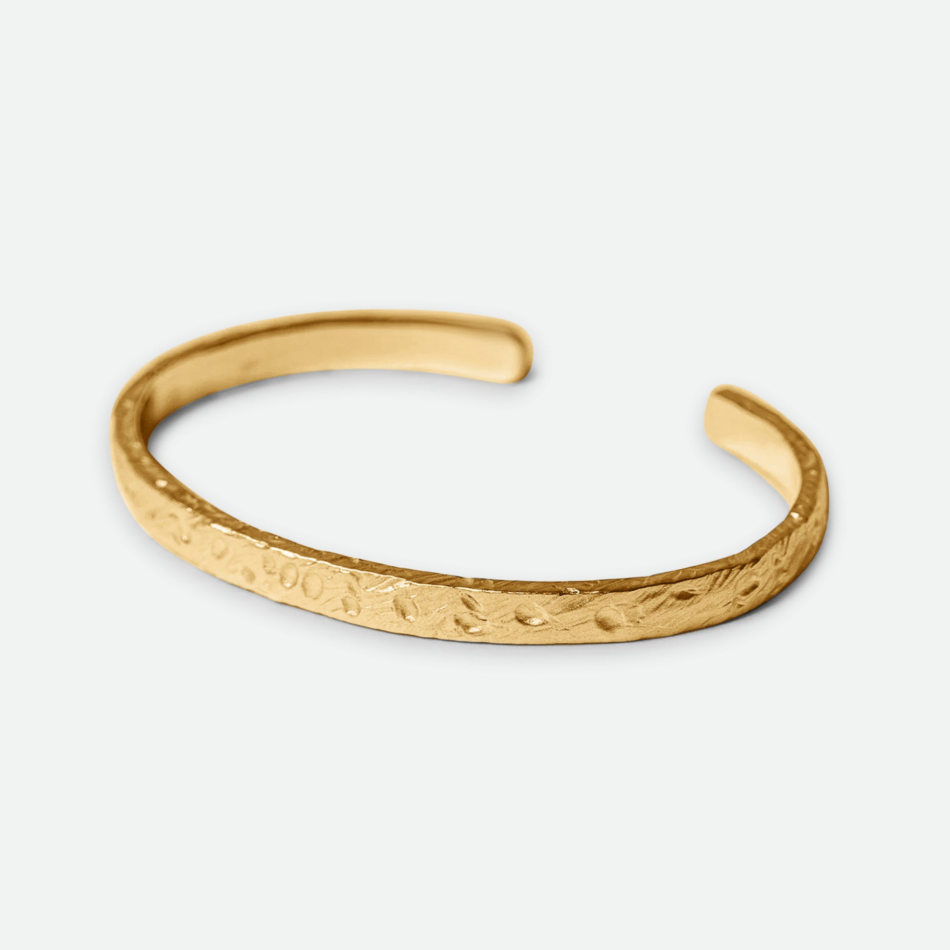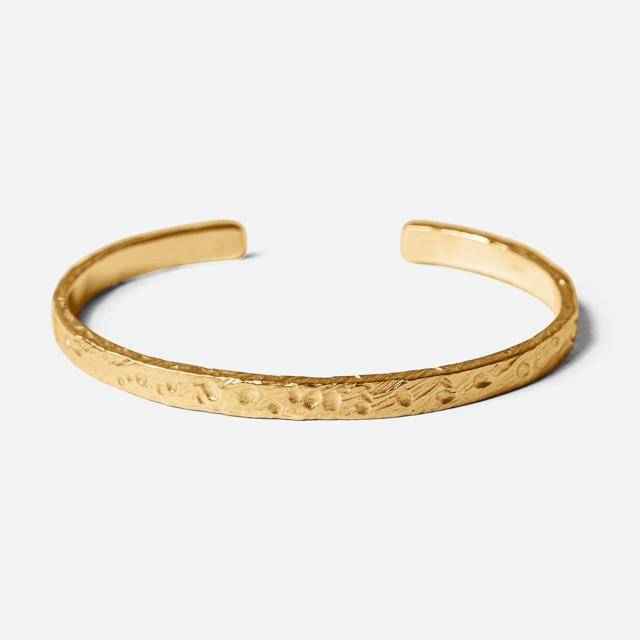 The Micky Cuff Gold: lightweight, elegant, and vintage-inspired, this cuff embodies meticulous craftsmanship and attention to detail. Crafted from recycled sterling silver and dipped in gold vermeil, its sandblasted details add a unique appeal. With an adjustable opening for a perfect fit, elevate your style with this timeless cuff.