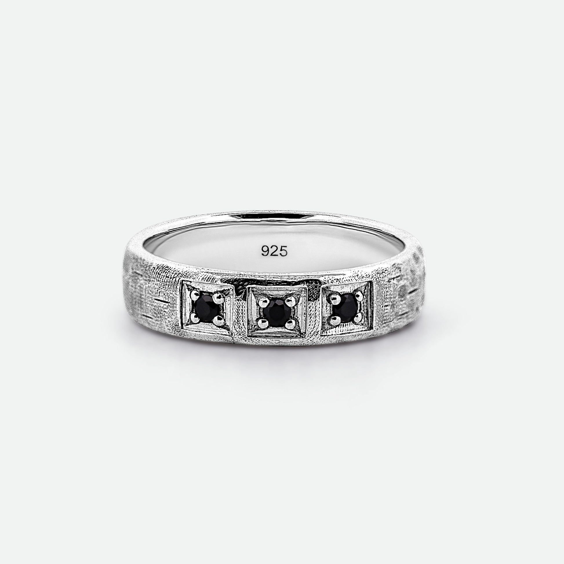 The Trilogy Ring features three bezel-set Black Diamond Cubic Zirconias arranged across a structured, hand-textured band, crafted from recycled 925 sterling silver. Each stone sits within a defined square setting, creating a balanced profile that contrasts refined detail with raw surface character. Subtle oxidisation enhances the outer texture.