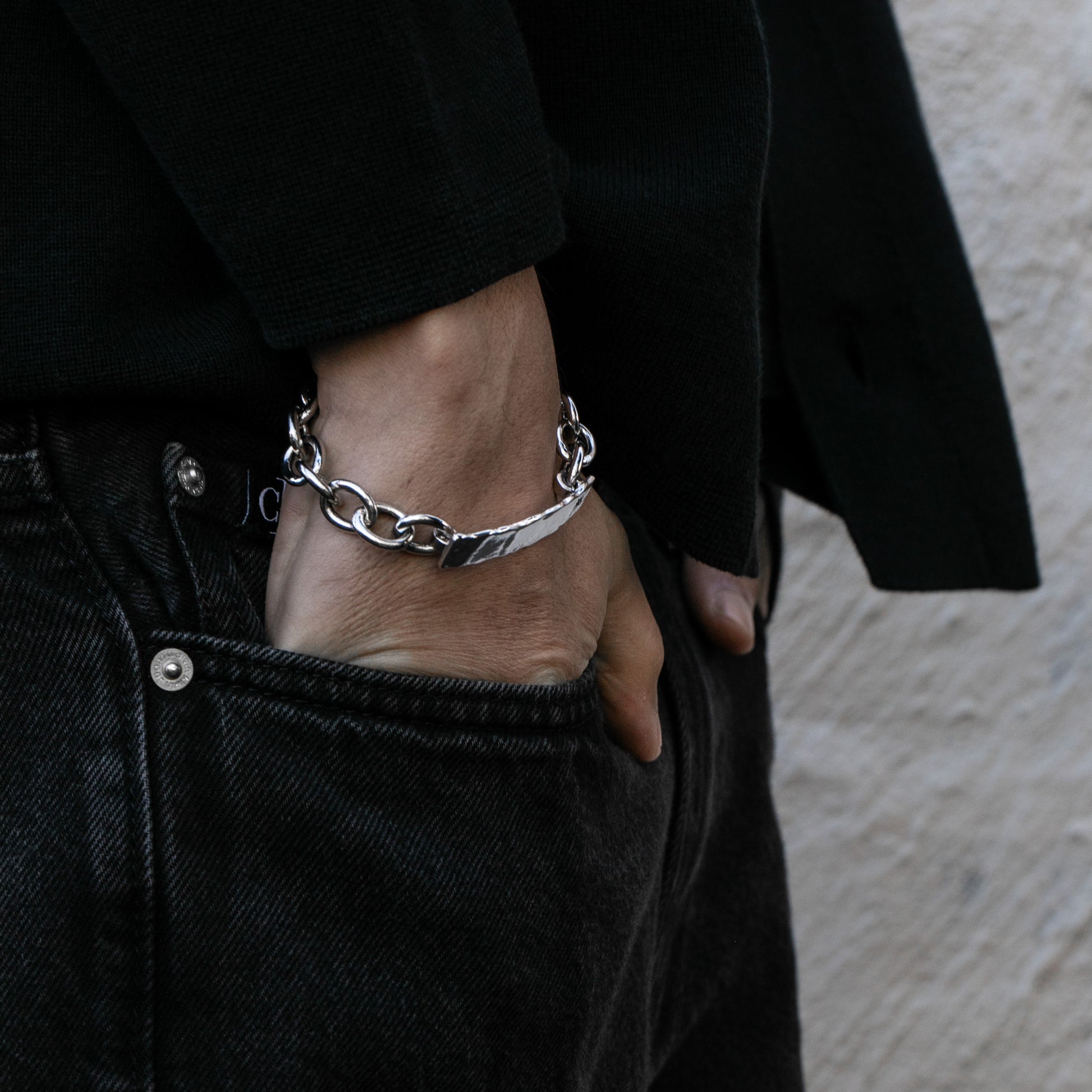 The Virgil Bracelet Chain is a men’s bracelet chain built for those who appreciate refined detail and unique minimalism. Handcrafted from solid recycled 925 sterling silver, the bracelet features a high-polished finish with subtle oxidisation and a hand-hammered texture for depth and contrast.